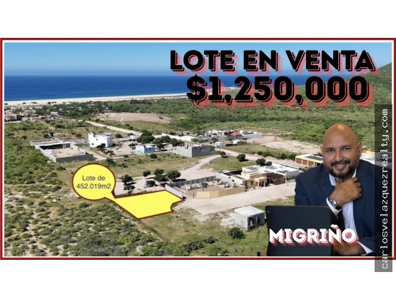 Este lote de 452.019 m² está ubicado en esquina, dentro de una cerrada de solo 8 lotes con acceso controlado. A solo 25 minutos de Cabo San Lucas, en la zona de Migriño, una zona que sigue avanzando y donde la tranquilidad es una constante. Ideal para una casa de playa o un proyecto de renta vacacional que pueda consolidarse a mediano plazo.